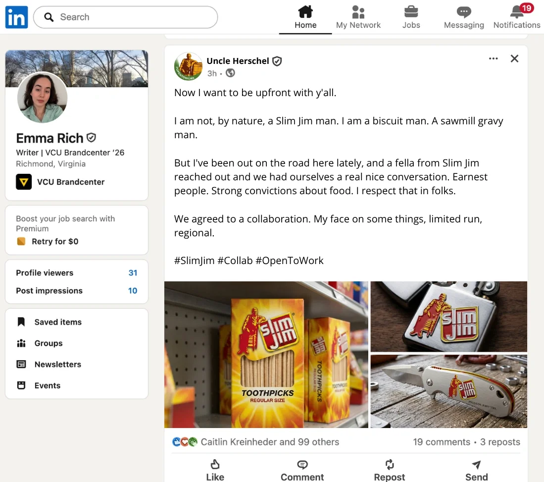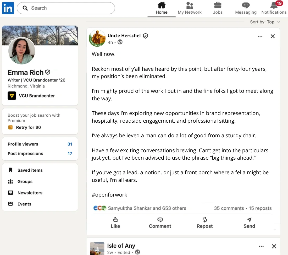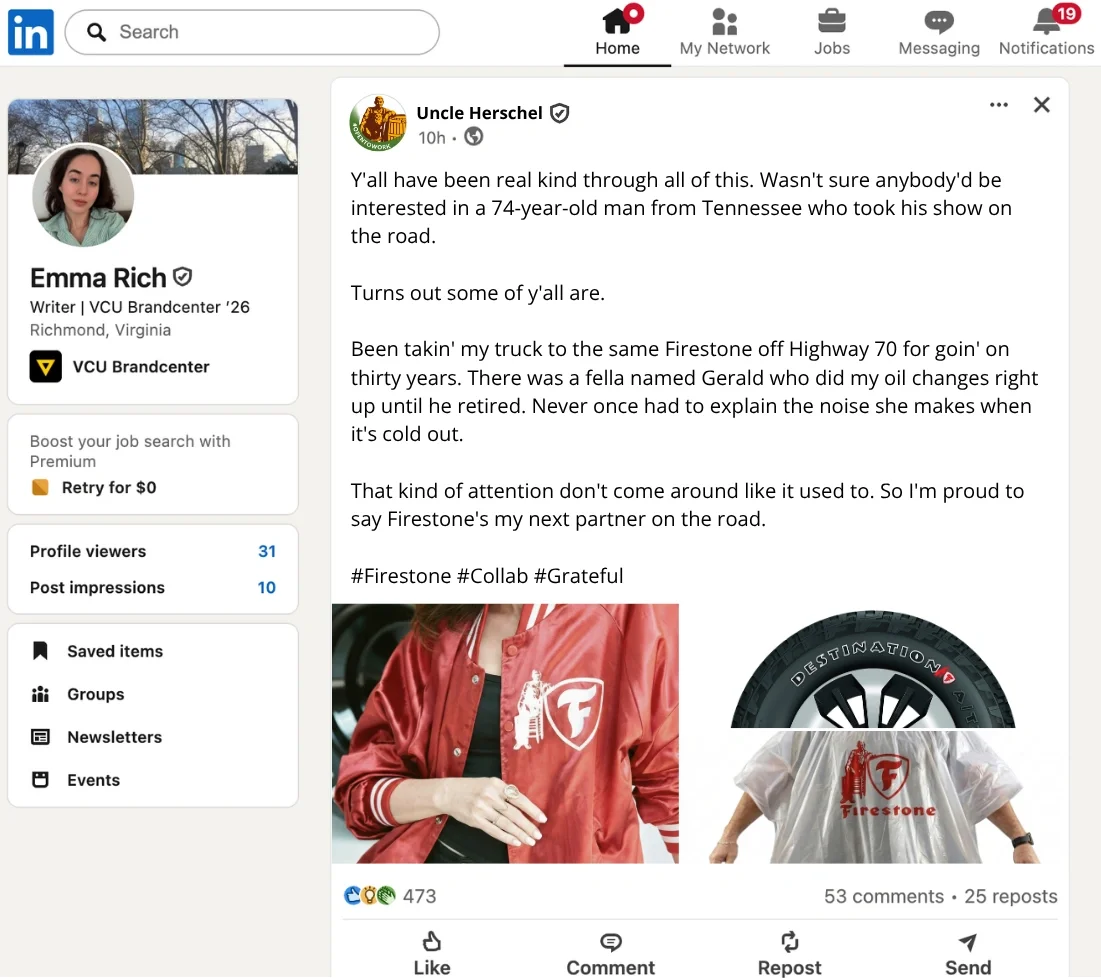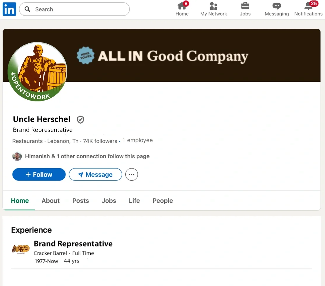Uncle Herschel was removed from Cracker Barrel’s logo. So we concocted a story where he was fired and started freelancing with other brands.