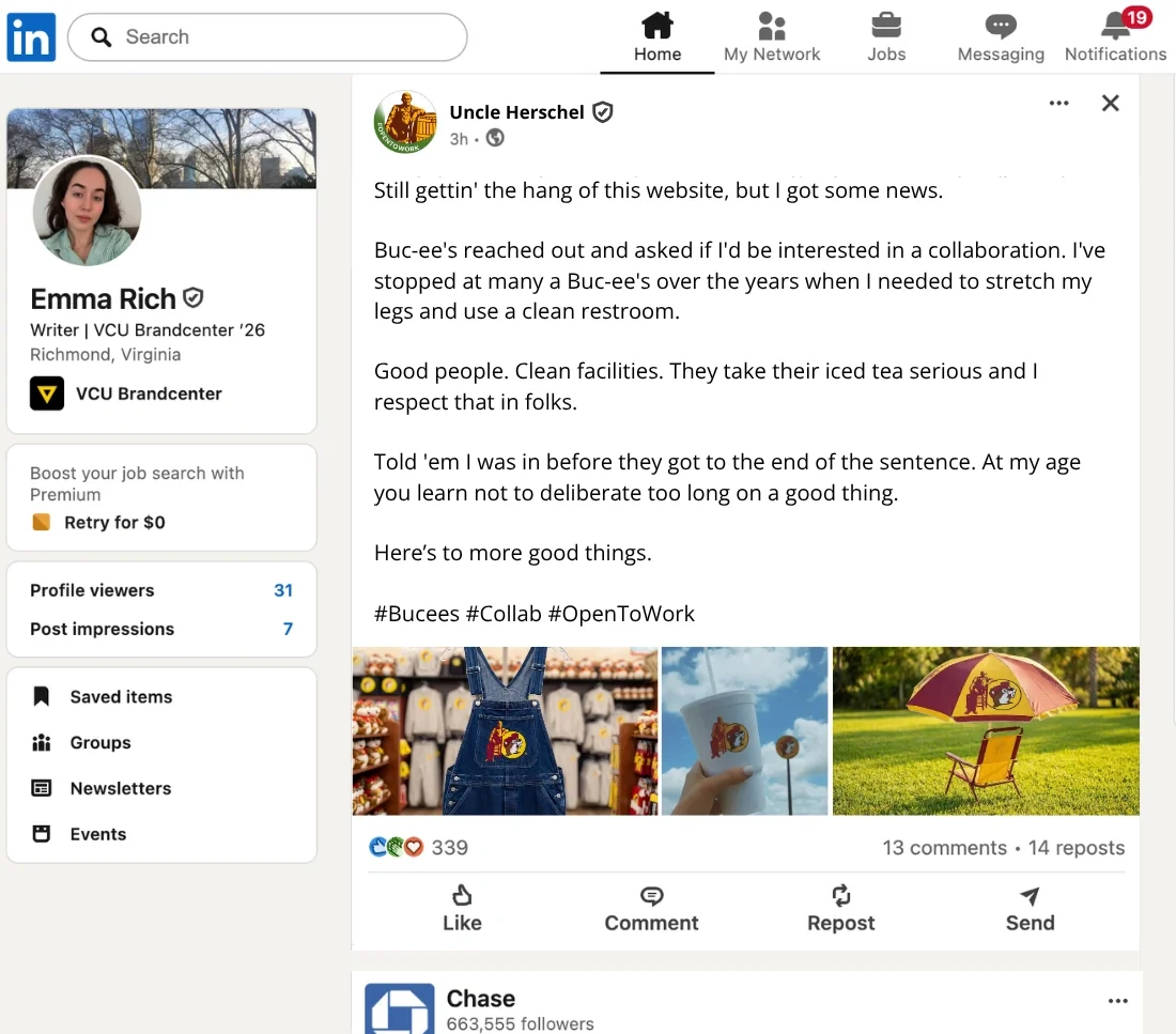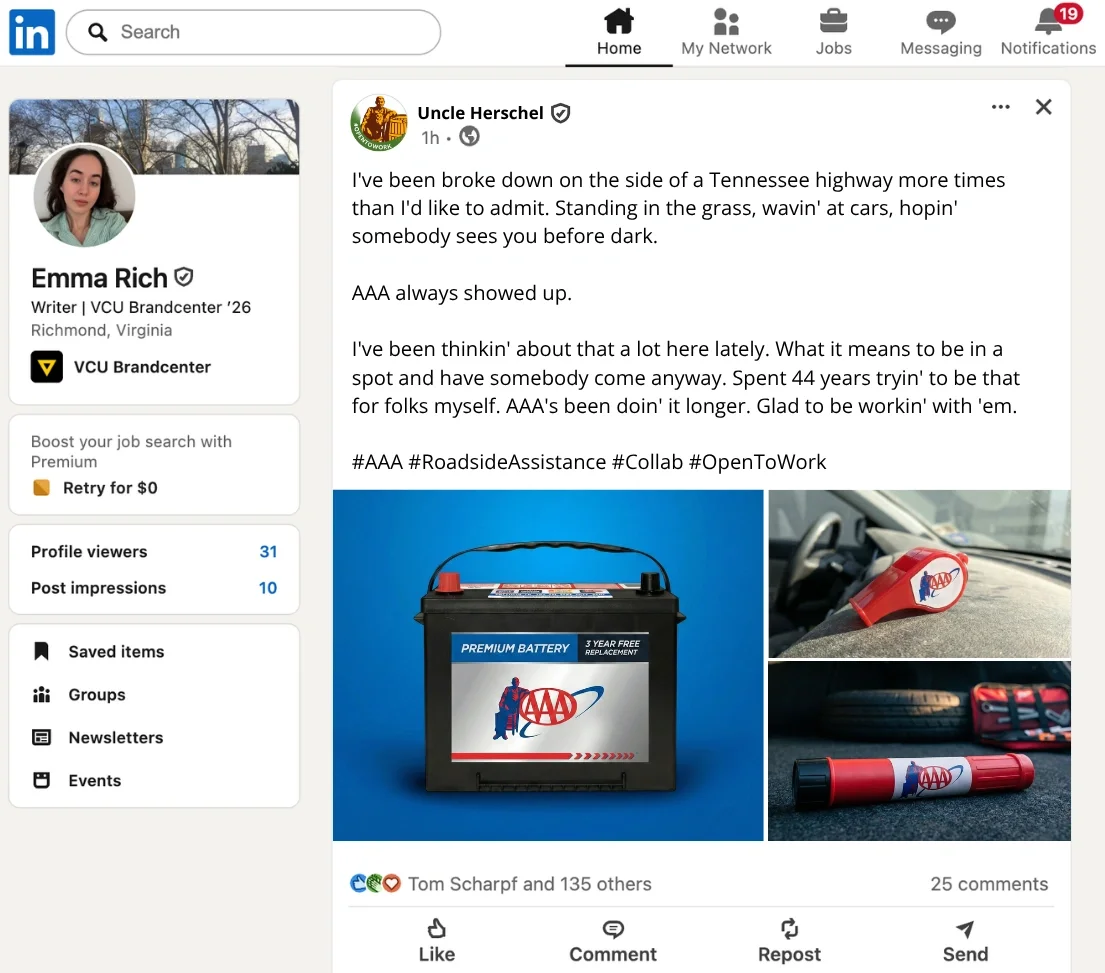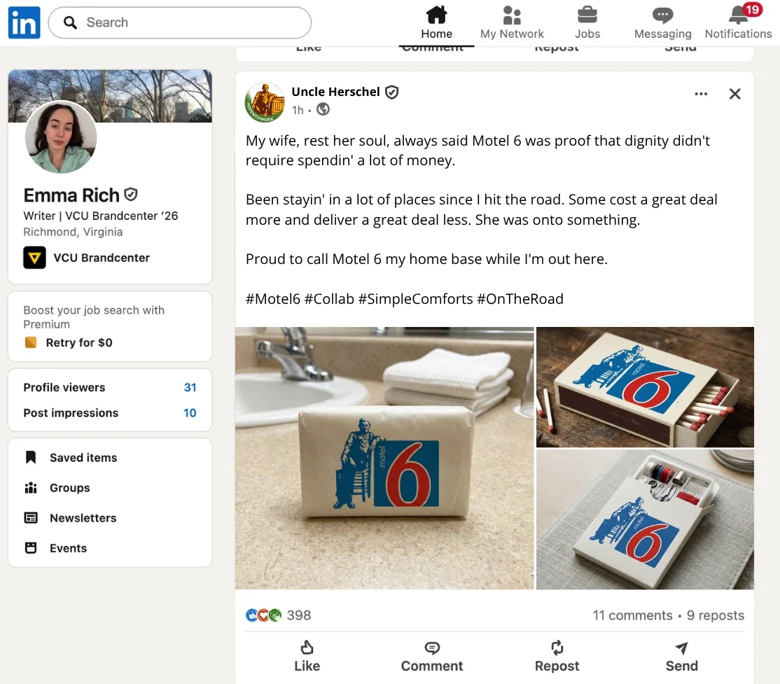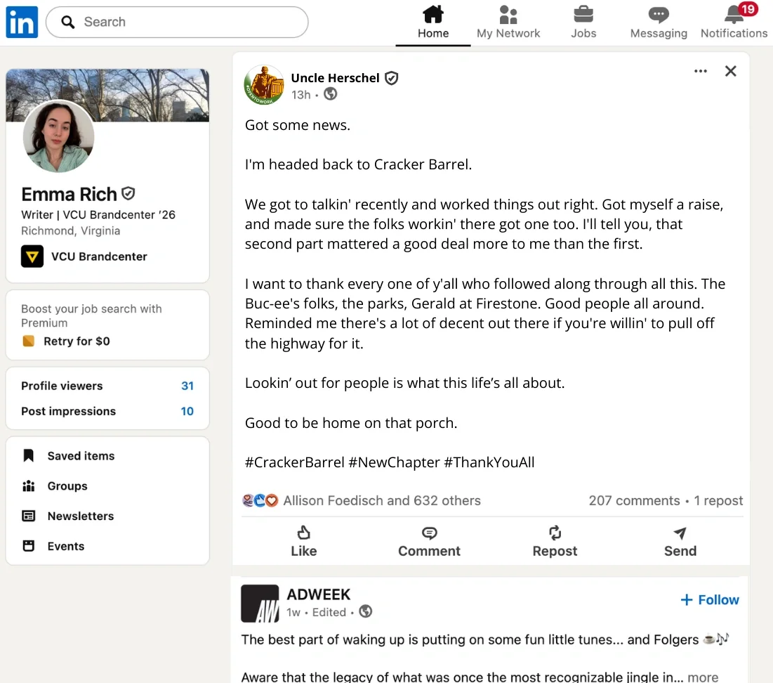 Uncle Herschel was removed from Cracker Barrel’s logo. So we concocted a story where he was fired and started freelancing with other brands.
