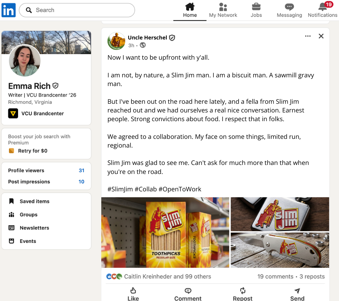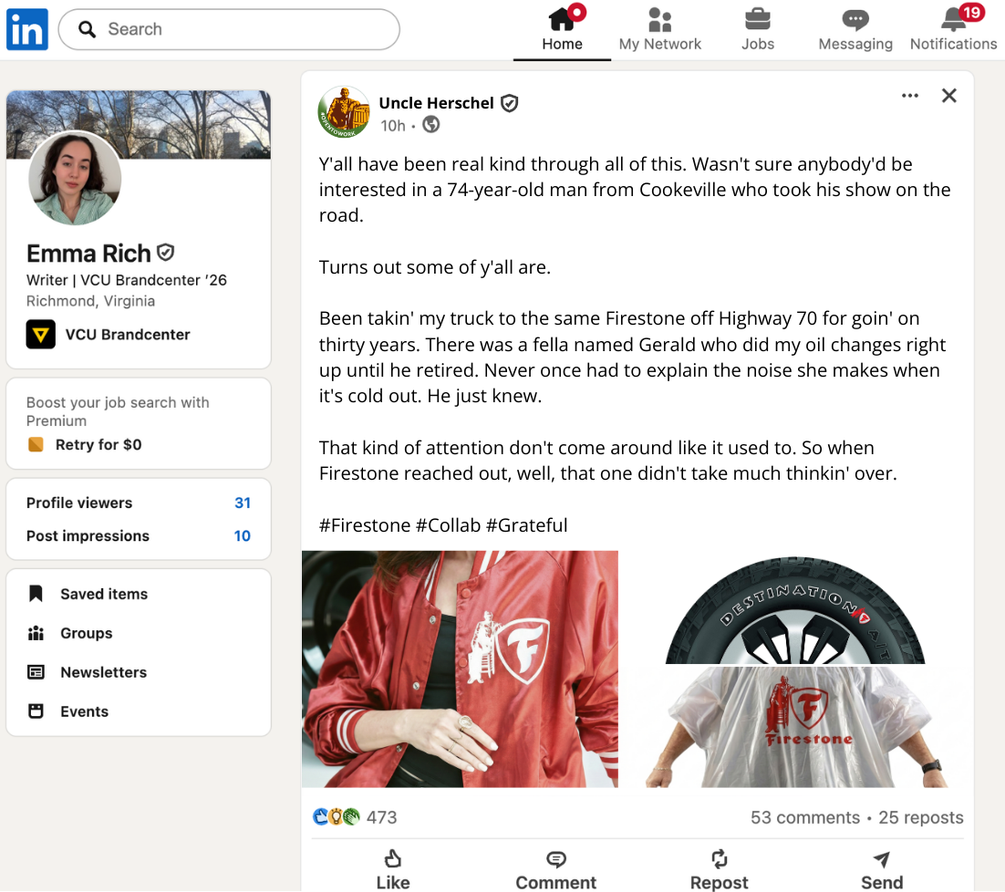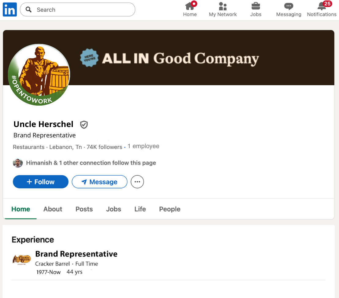 Because Uncle Herschel was removed from Cracker Barrel’s logo, we concocted a story where he was fired and started freelancing with other brands.