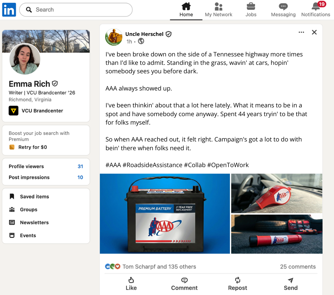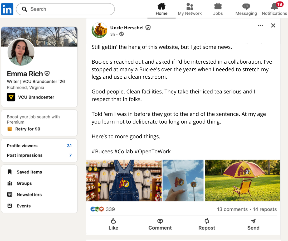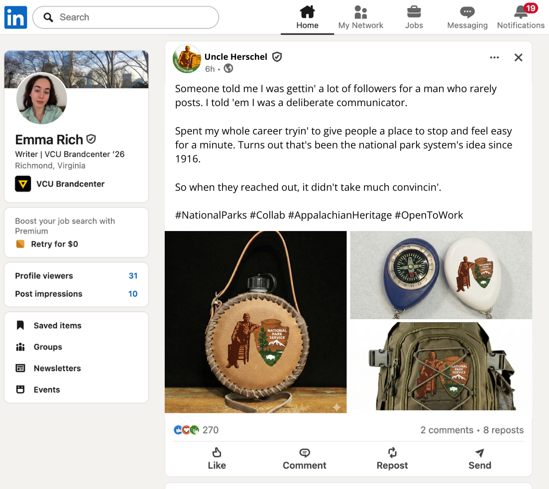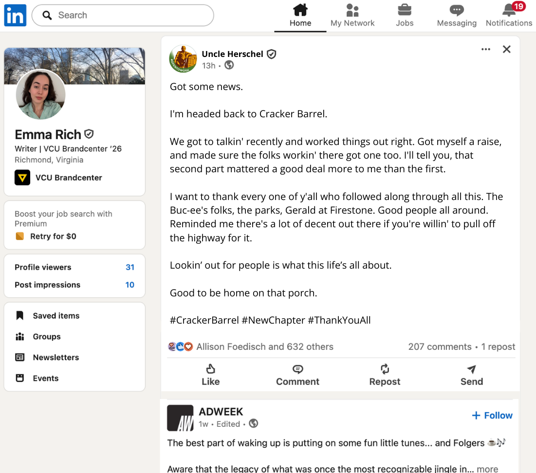 Because Uncle Herschel was removed from Cracker Barrel’s logo, we concocted a story where he was fired and started freelancing with other brands.